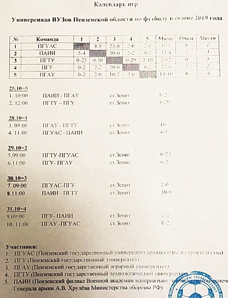Универсиада ВУЗов Пензенской области по футболу в сезоне 2019г.